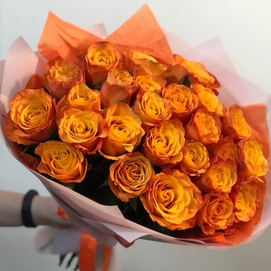 На фото букет из 25 оранжевых роз. В составе: роза 25 шт, дизайнерская упаковка 1 шт, атласная лента 1 шт, . Все цветы свежие и ароматные, букет красиво оформлен и отлично подходит для подарка. Доступна доставка цветов или самовывоз.
