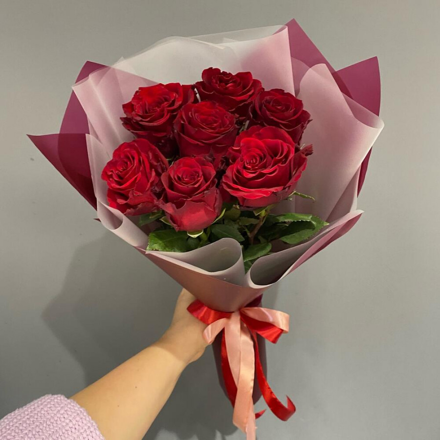 На фото букет из 7 бордовых роз. В составе: роза 7 шт, дизайнерская упаковка 1 шт, атласная лента 1 шт, . Все цветы свежие и ароматные, букет красиво оформлен и отлично подходит для подарка. Доступна доставка цветов или самовывоз.