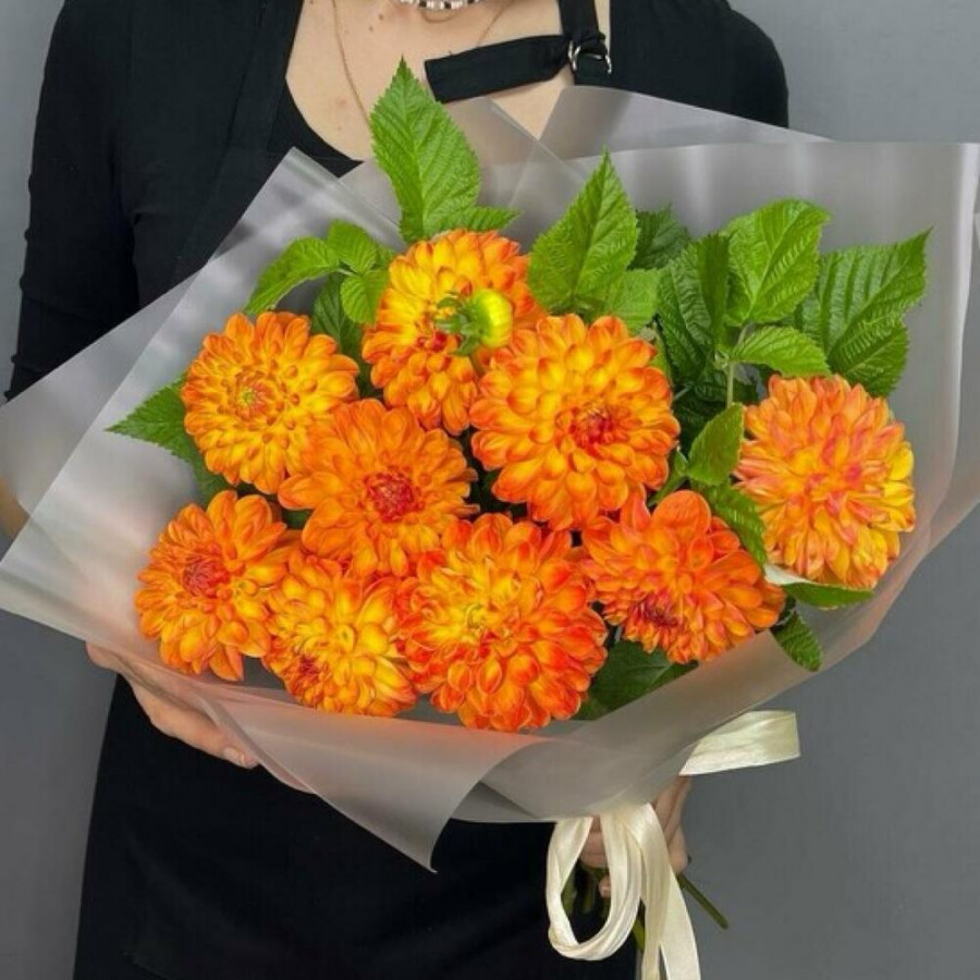 На фото букет из 9 оранжевых георгин. В составе: георгина 9 шт, зелень 3 шт, дизайнерская упаковка 1 шт, атласная лента 1 шт, . Все цветы свежие и ароматные, букет красиво оформлен и отлично подходит для подарка. Доступна доставка цветов или самовывоз.
