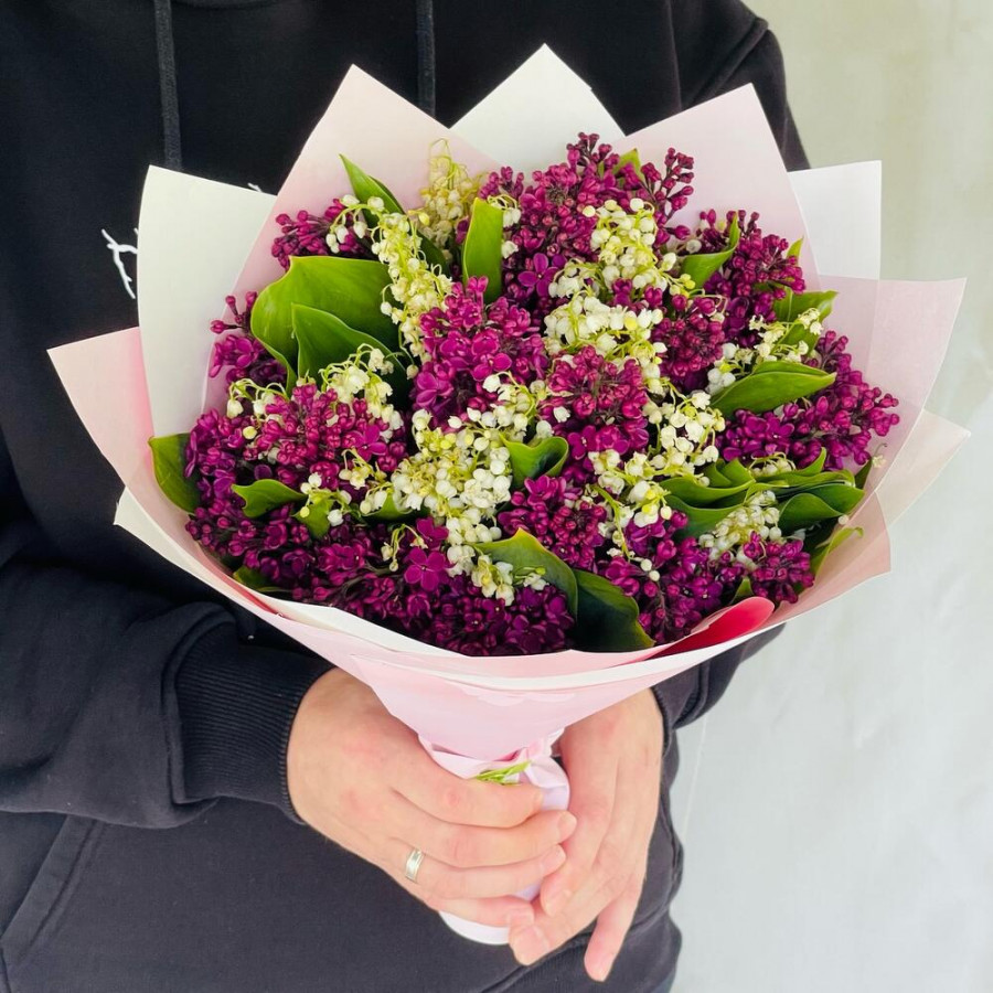 На фото букет из ландышей и сирени. В составе: сирень 7 шт, ландыш 5 шт, дизайнерская упаковка 1 шт, атласная лента 1 шт, . Все цветы свежие и ароматные, букет красиво оформлен и отлично подходит для подарка. Доступна доставка цветов или самовывоз.