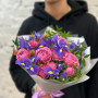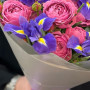 Букет из розовых пионовидных роз и синих ирисов в Азнакаево